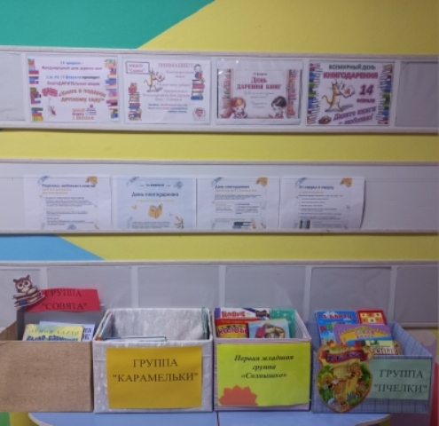 14 февраля отмечается Международный день книгодарения. Этот праздник объединяет всех, кто считает, что книга — лучший подарок, и для кого чтение является интересным и познавательным занятием. Во всех группах нашего детского сада прошла акция "Подари книгу с любовью". Родители с удовольствием приняли в ней участие. Это замечательный повод подарить книжку в группу, где потом вместе можно почитать и посмотреть красивые иллюстрации. Этот замечательный праздник стал не только прекрасной традицией, но дал возможность проявить добро.